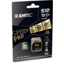 Emtec ECMSDM512GXC10SP. Capacidad: 512 GB, Tipo de tarjeta flash: MicroSDXC, Clase de memoria flash: Clase 10, Tipo de memoria interna: UHS-I, Velocidad de lectura: 100 MB/s, Velocidad de escritura: 95 MB/s, Clase de velocidad UHS: Class 3 (U3), Clase de velocidad de vídeo: V30. Color del producto: Negro, Oro